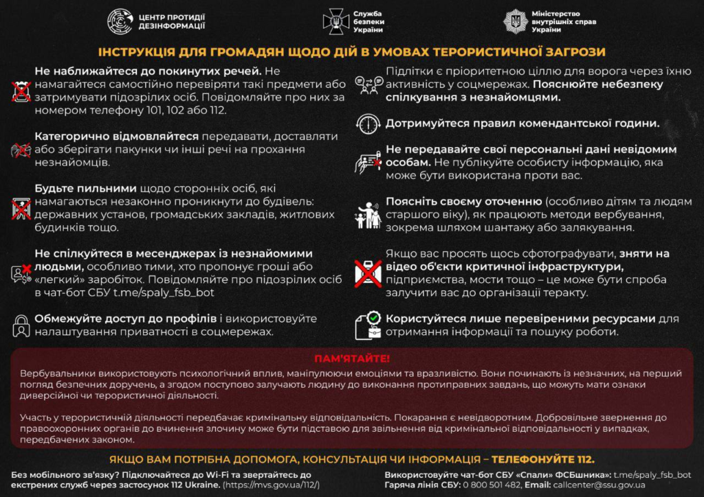 Співпраця з ворогом, фото- чи відеозйомка об’єктів критичної інфраструктури, передача даних або вчинення диверсій за «винагороду» — це не «легкий підробіток». Це тяжкі злочини проти національної безпеки.